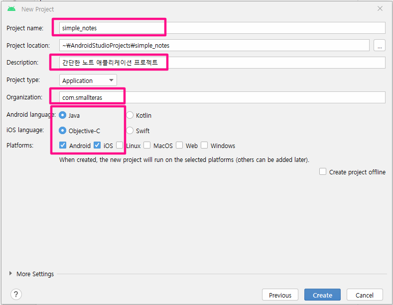 New flutter project를 선택한 후 아래와 같이 새로운 Flutter 프로젝트를 만들어 주세요.
