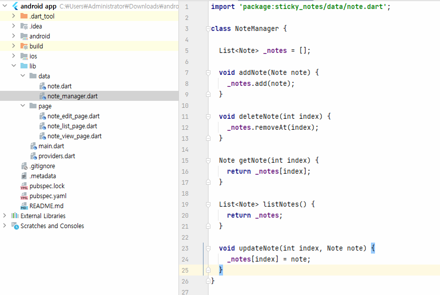 - void addNote(Note note) : 노트를 추가하는 함수입니다. 새로 추가할 노트 데이터를 리스트에 추가함