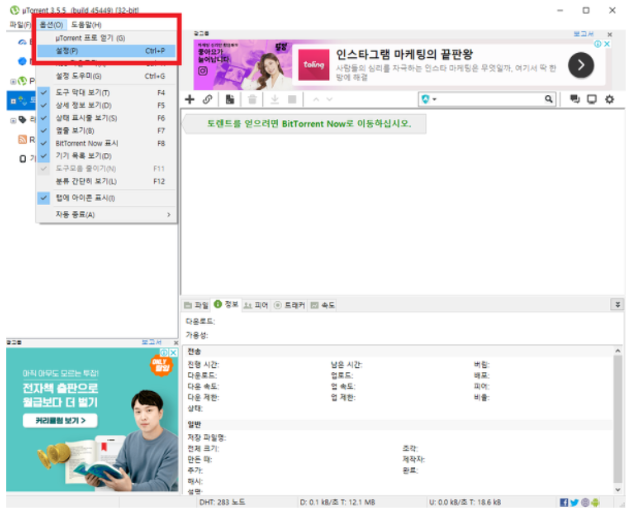 대표적으로 uttorent나 bit토렌트와 같은 소프트웨어들을 많이 사용합니다. 이런 소프트웨어를 사용할 때 특별히 설정을 변경하거나 할 것은 없지만 설정에 들어가 몇개만 변경해 주면 매우 빠르게 다운로드가 가능합니다.