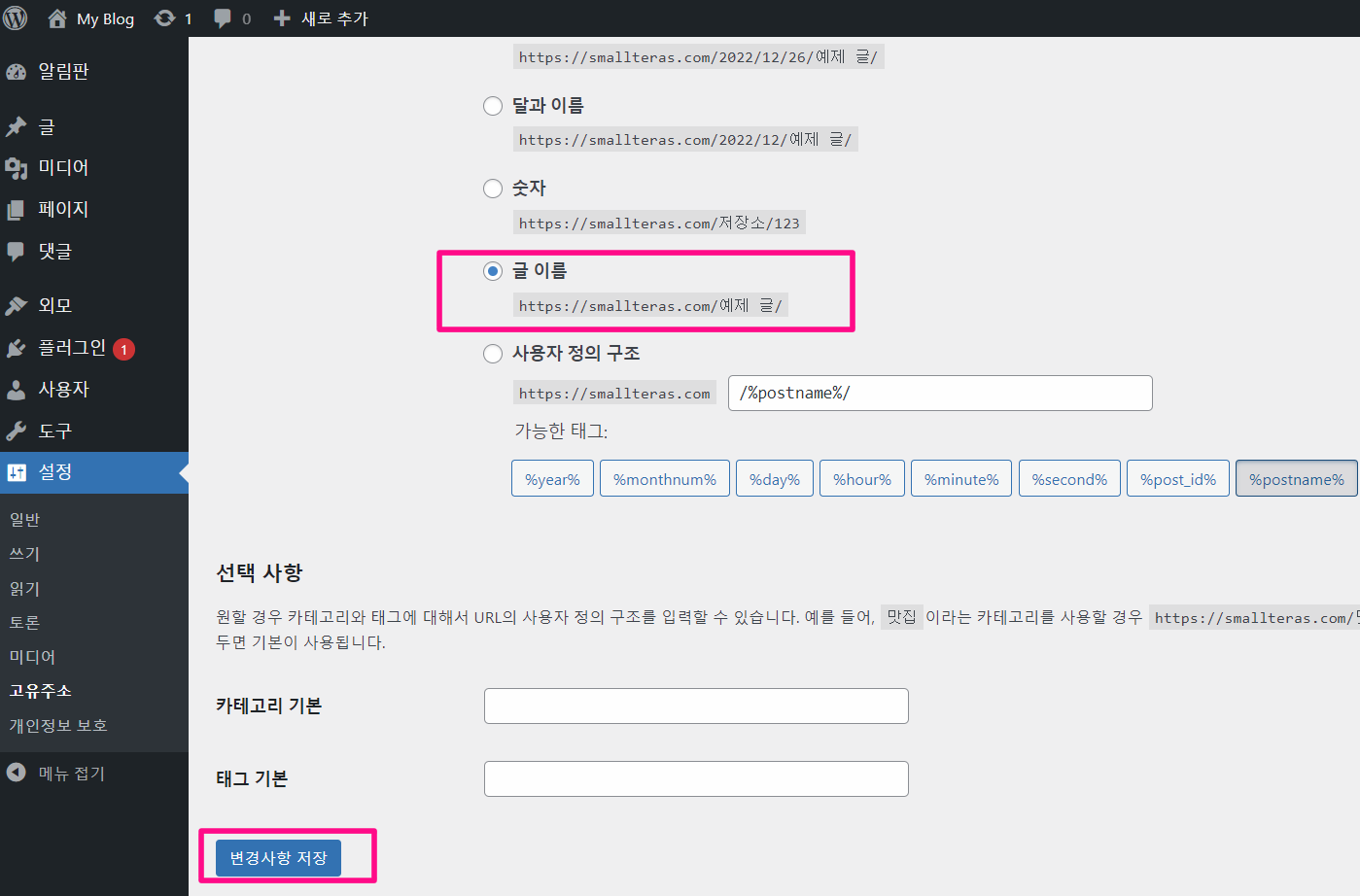 검색 최적화를 위해 ‘글 이름’을 선택한 뒤 변경 사항 저장을 클릭해 주세요.