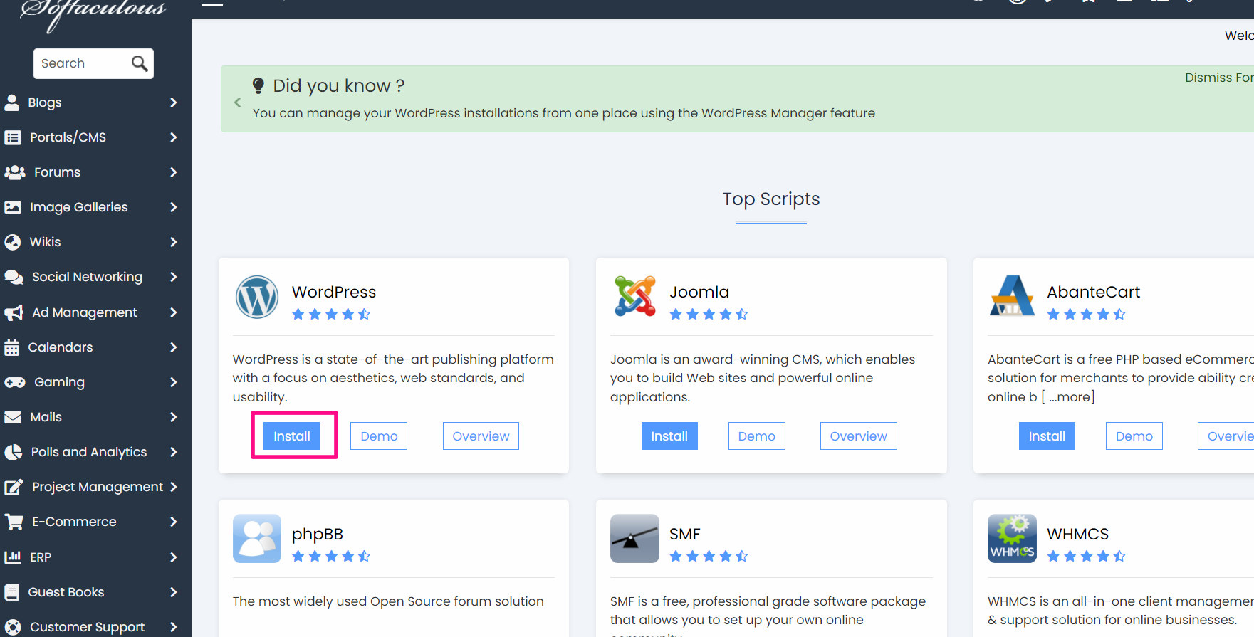 아래보이는 워드프레스 설치화면에서 Install 버튼을 클릭해 주세요.