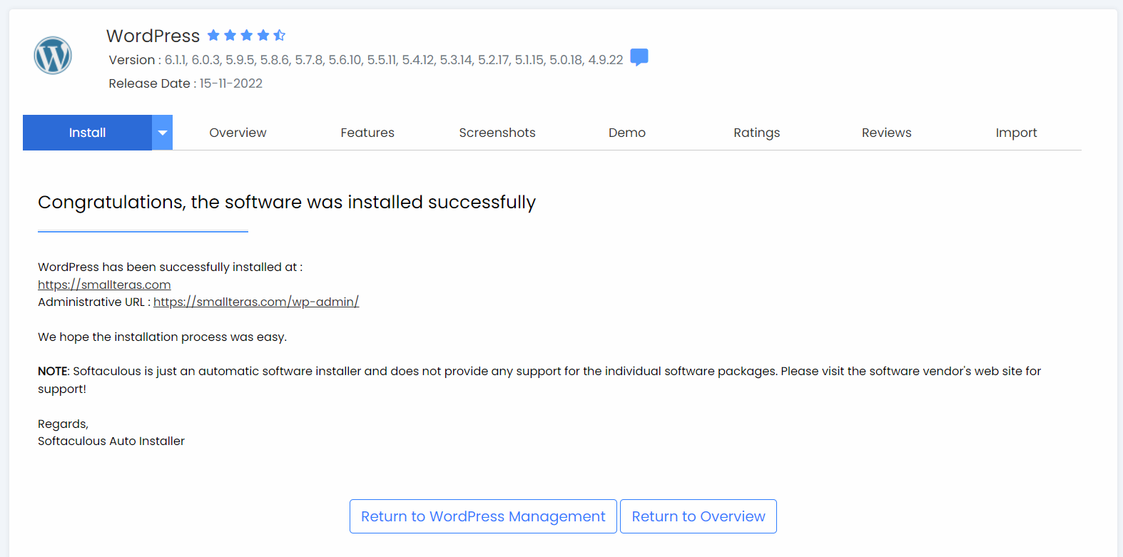 설치된 도메인 주소를 확인할 수 있고 아래 관리자 페이지로 접속할 수 있는 주소도 확인할 수 있어요.